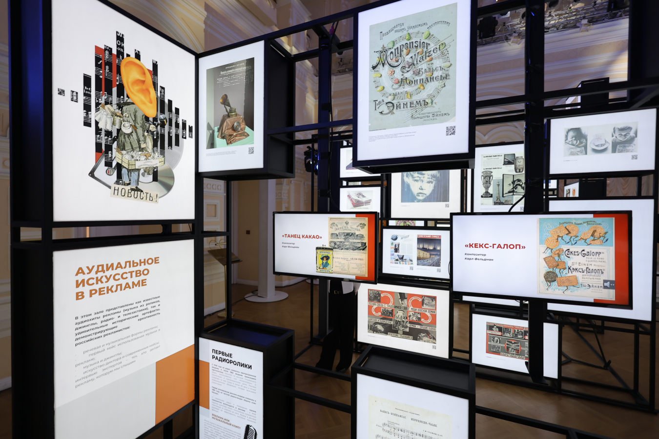 В третьем зале размещена ретроспектива развития аудиорекламы: от «райков» — зазывающих стихов, распространяемых на ярмарках, до современных симфоний, написанных нейросетями.