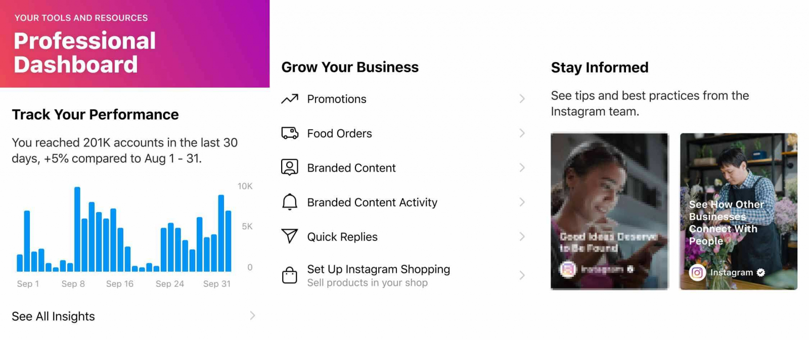 Соцсеть предлагает владельцам бизнес-аккаунтов создавать более качественный контент, изучая практики, применяемые похожими компаниями. Для этого владельцу необходимо нажать на кнопку «Открыть профессиональную панель» в верхней части своего бизнес-аккаунта. В разделе «Следите за новостями» нажать на руководство «Как другие компании общаются с пользователями». Пользователь увидит подборку постов, как бизнес взаимодействует с пользователями, и сможет выбрать любой для просмотра.
