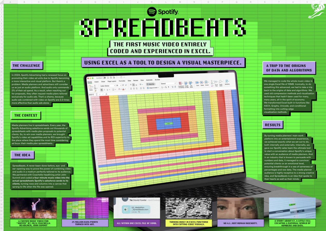 «Spreadbeats» от Spotify превратила Excel в музыкальный опыт. Чтобы доказать, что Spotify — это не только стриминг, а полноценный интерактивный медиаканал, команда создала первый в мире музыкальный клип, полностью закодированный в Excel. Без AI — только формулы, ASCII-графика и цветовая заливка: 25 миллионов ячеек стали пикселями четырехминутного видеотрека, написанного специально для этого проекта.