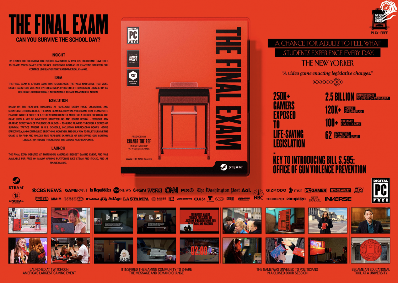 The Final Exam — survival‑игра от первого лица, где ты не убиваешь, а пытаешься выжить. Игрок оказывается в шкуре американского школьника, в середине дня начинается стрельба, и нужно пройти весь уровень, сталкиваясь с реальными (и страшными) законодательными пробелами. В финале игроки открывают реальные истории жертв и узнают о законопроектах, которые могли бы их спасти.