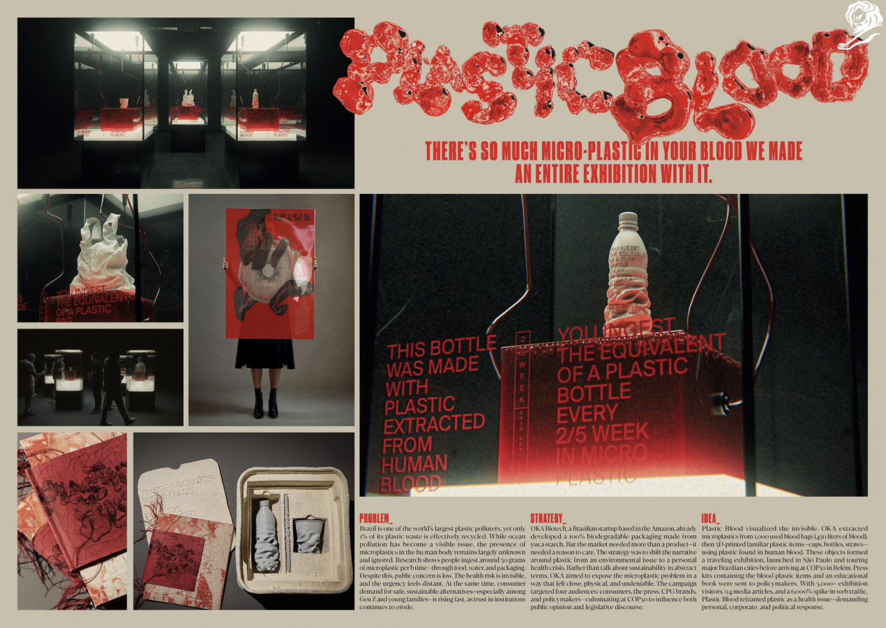 Стартап OKA Biotech превратил абстрактную экологическую угрозу в шокирующую реальность: в Бразилии запустили выставку «Plastic Blood», в которой все экспонаты (бутылки, чашки и скульптуры) были созданы из микропластика, извлеченного из человеческой крови. Проект был создан для того, чтобы сделать проблему пластика личной, а не абстрактной. Выставка сопровождалась образовательным блоком, лекциями и книгой, созданной из той же «пластиковой крови».