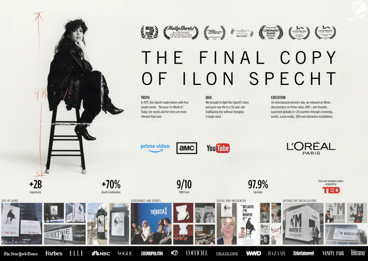 Вместо того чтобы перепридумать манифест, бренд сделал шаг назад и показал, что в этих словах все еще сконцентрирована сила. 18-минутный фильм о судьбе и влиянии Илoн Спехт вышел на Prime Video, AMC и YouTube в Международный женский день. Кампания запустилась сразу в 20+ странах: показы, наружка, интерактивные инсталляции, обсуждения с инфлюенсерами — все ради того, чтобы доказать, как важно не забывать имена женщин, которые первыми прорвали барьеры.