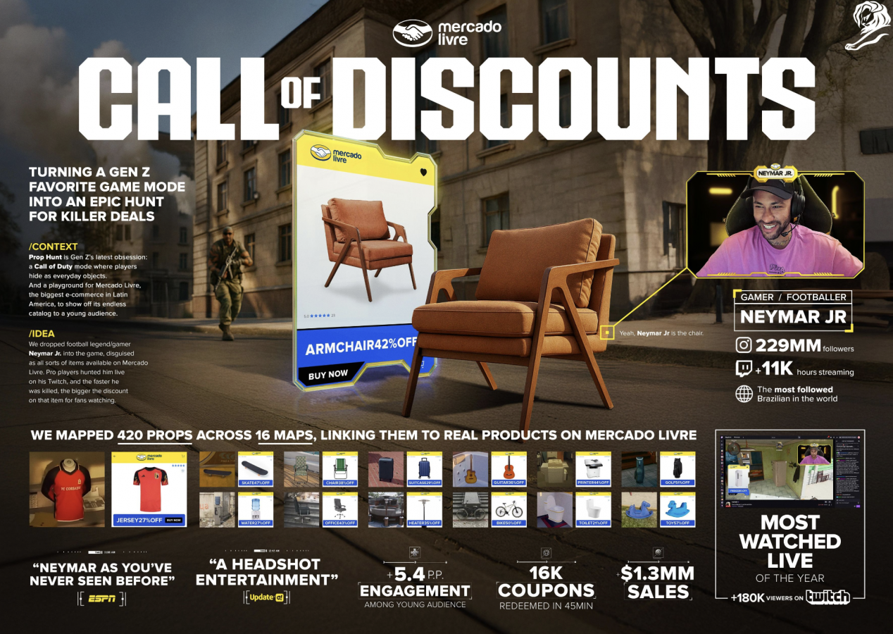 Чтобы рассказать молодежи о своём безумно широком ассортименте, Mercado Livre зашел в любимую механику Gen Z — Prop Hunt. В коллаборации с Call of Duty и самым популярным стримером Бразилии, Неймаром, они превратили игру в распродажу: футболист маскировался под товары с сайта, и чем быстрее его находили и «убивали» — тем выше становилась скидка на этот товар в реальной жизни.