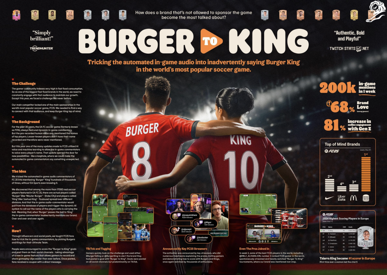 Когда бренд не может официально спонсировать игру, он превращает саму игру в рекламу. Burger King нашел хак в футбольном симуляторе FC24: в новом выпуске комментаторы озвучивались AI, и если игрок назывался фамилией из базы, система проговаривала ее в эфире.
