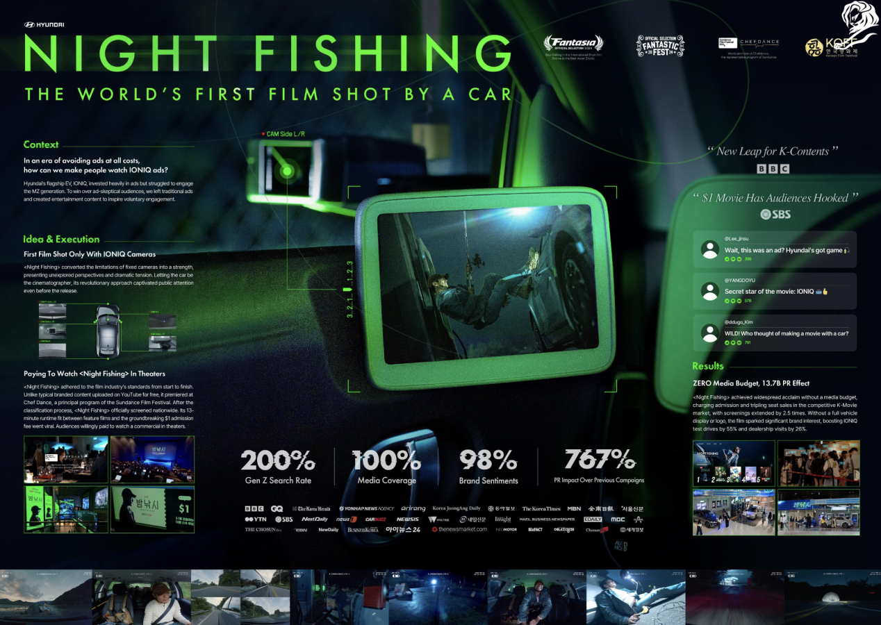 «Night Fishing» от Hyundai — первый в мире фильм, полностью снятый камерой автомобиля. Чтобы не просто рассказать, а показать возможности модели IONIQ, бренд превратил промо‑ролик в полноценное кино, снятое встроенными в машину камерами. Это настоящий жанровый триллер, который попал в официальную программу кинофестивалей, включая Sundance.