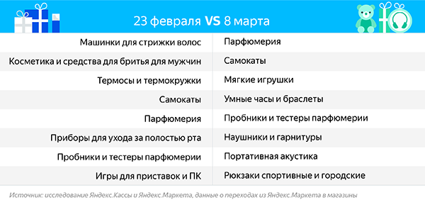 При проверке данных переходов перед 23 февраля выяснилось, что пользователи начинают активно интересоваться машинками для стрижки (в период с 15 по 18 февраля). На втором месте — косметика и средства для бритья, на третьем — термокружки. Еще повышался интерес к самокатам, парфюмерии, приборам для ухода за полостью рта и играм для компьютеров и консолей.