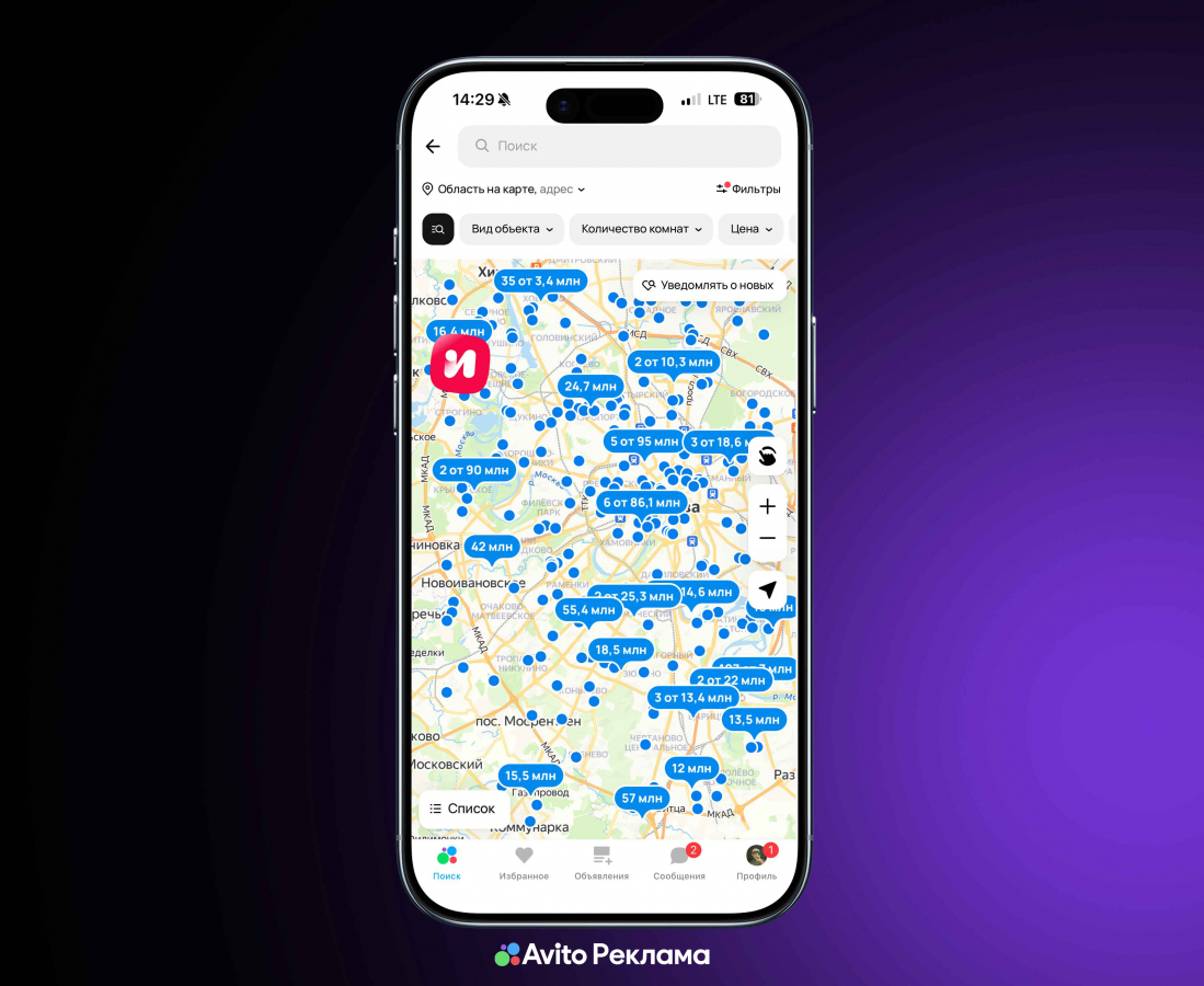 Реклама в формате точки на картах «Авито Недвижимости» отвечает этому запросу. Новый инструмент позволяет брендам выделяться на фоне конкурентов за счет нестандартной механики, а пользователям — получать релевантные предложения и не отвлекаться от решения задач на площадке.