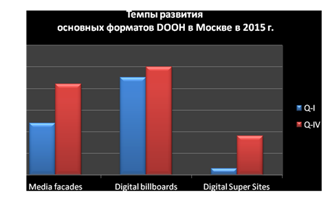 По состоянию на начало IV квартал 2015 года, в Москве установлено: 50 (а всего по России – 86) цифровых билбордов 3х6 (Gallery); 10 digital super sites 5х15 «ЛАЙСА Диджитал» и 8 Russ Outdoor на ТТК и вылетных магистралях. 14 Digital Super Sites (26 digital поверхностей) 5х15 в Московской области. Темп развития очень высок. В начале 2015 года в Москве практически ничего из этого не было, кроме цифровых билбордов Gallery (в Москве на начало 2015 года было 46 цифровых билбордов Gallery). В 2016 темп развития DOOH, вероятнее всего, будет еще выше.