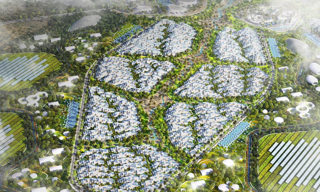Город будет включать различные аквазоны, места обитания диких животных, спортивные площадки и дворы. Протяжённость беговой дорожки составит 35 км, также части города соединят велодорожки и трассы для передвижения на лошадях. В центре города разместится зона отдыха с водоемами, из неё можно легко попасть в любую зону.