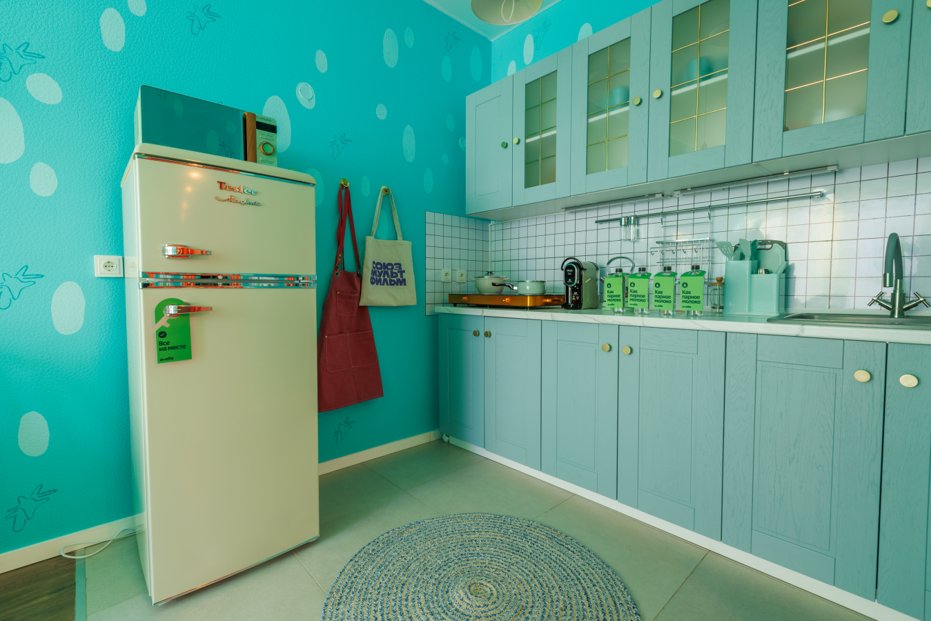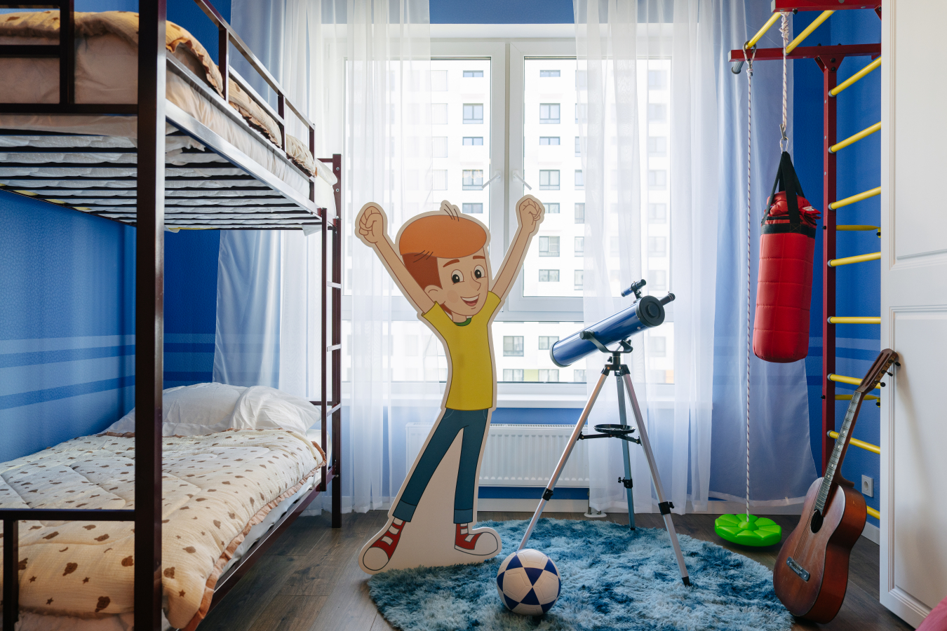 Квартира площадью 65 кв. м. включает в себя две комнаты (одна — Дяди Федора, вторая — спальня родителей), большую кухню-гостиную, прихожую, два санузла и два балкона. Здесь есть все для комфортного проживания — от современной техники до уютных деталей, таких как «шведская стенка» для детей и кроватка для самых маленьких. Вдохновленная любимыми героями, квартира позволяет гостям стать частью волшебного мира «Простоквашино» и ощутить себя персонажем мультсериала.