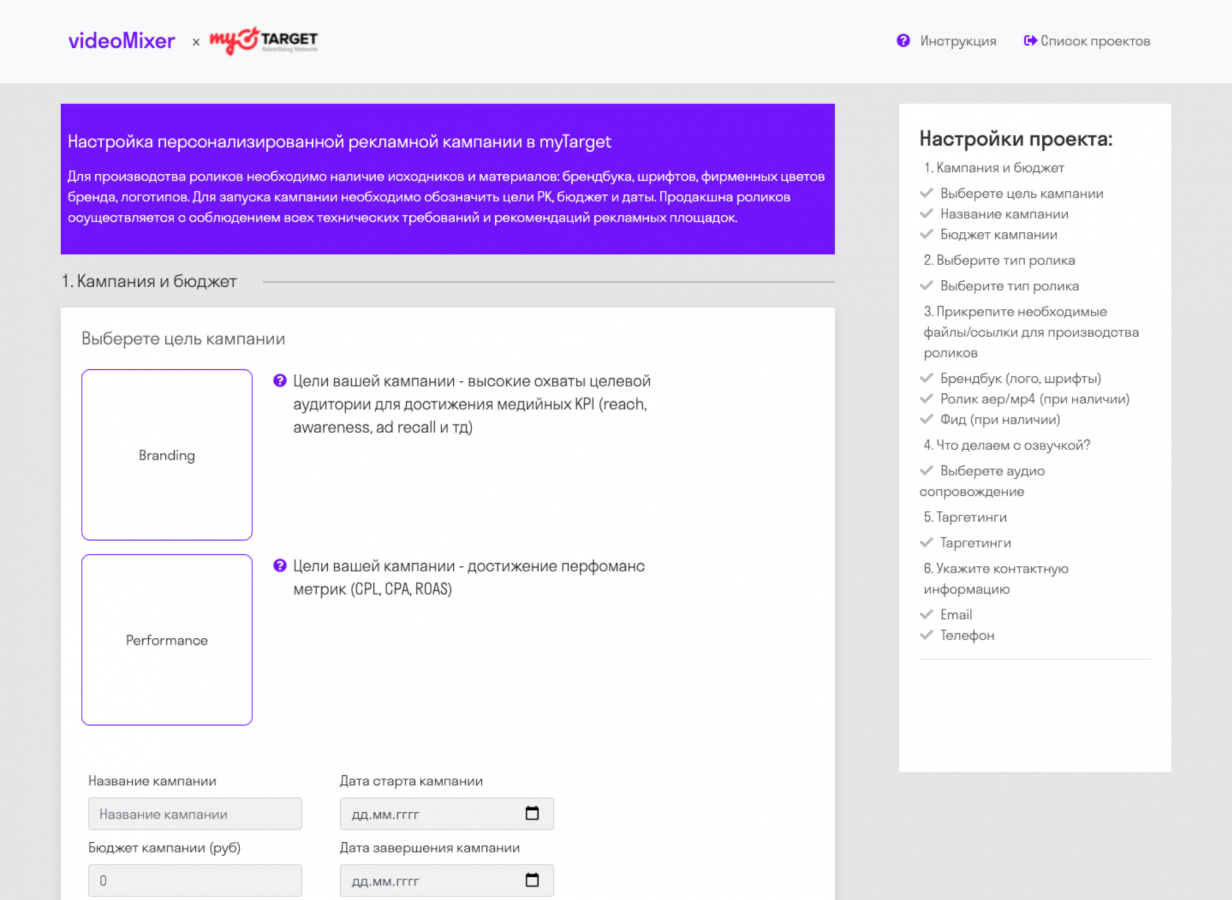При создании видео требуется указать название кампании, цели, бюджет и даты проведения. В сервисе доступно два вида целей: branding и performance. Первый вариант предполагает работу на медийные показатели (узнаваемость рекламы, знание бренда