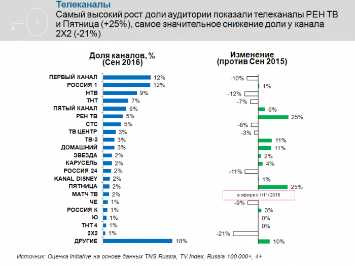 Новый телесезон открыли ростом доли телеканалы ТВ-3 (+11%), “Домашний” (+11%), “Звезда” (+2%), “Пятый” (+6%), “Карусель” (+4%), “Россия К” (+3%). Потери относительно предыдущего года показали НТВ (-12%), “Первый канал” (-10%), ТНТ (-7%), СТС (-6%), “ТВ Центр” (-3%), “Россия 24” (-11%), “Че” (-9%), а также 2х2 (-21%).