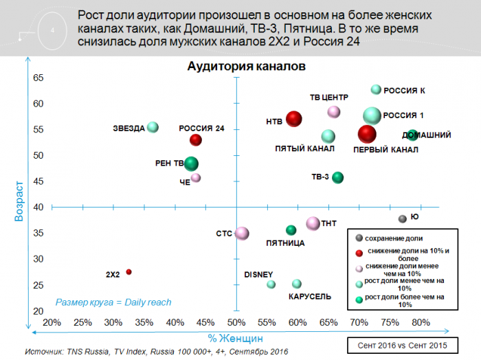Популярность последнего выросла за счет женской аудитории и успешного запуска нового проекта “Пацанки”, который привлек особое внимание молодых телезрительниц. Доля РЕН ТВ увеличилась, с одной стороны, благодаря возросшему интересу со стороны женской и более старшей аудитории, с другой стороны, за счет увеличения доли развлекательных программ.