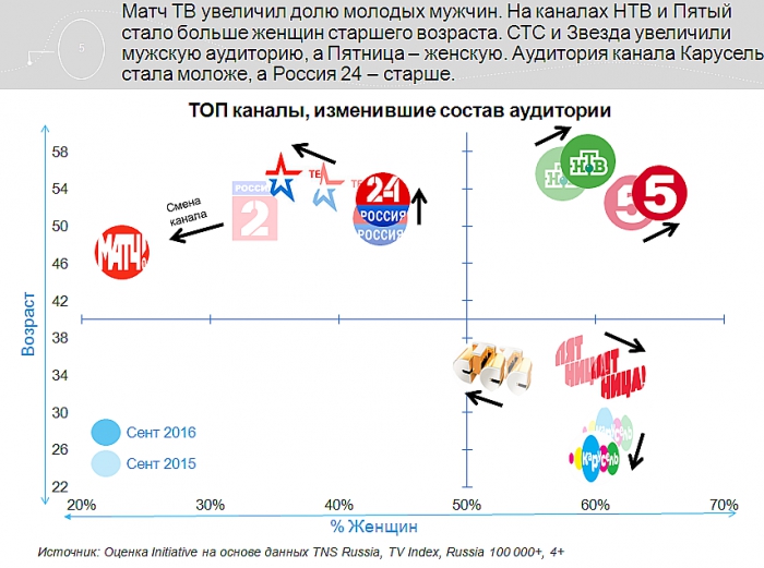 «В целом, аудитория нового телесезона выросла на 2%, в основном это произошло за счет увеличения женской аудитории и аудитории старше 65 лет. Рост продемонстрировали более женские каналы, в то же время снизилась аудитория мужских каналов.», - отмечает Мазурина Анна, генеральный директор Initiative.