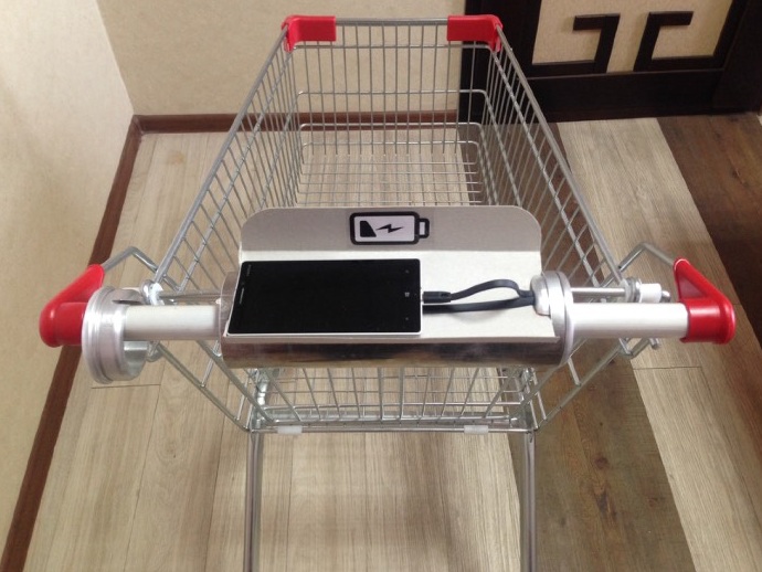 Устройство называется Charge Cart и подходит к торговым тележкам любых типов и размеров. Оно встроено в ручку тележки и позволяет непрерывно заряжать мобильные устройства, в том числе телефоны компании Apple и смартфоны с разъемом microUSB, в течение 8 часов.