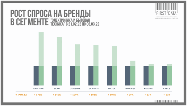 Продажи Haier, Gorenje и Zanussi выросли примерно вдвое. Что касается Apple, вопреки ожиданиям, санкции не поспособствовали, а даже немного притормозили рост спроса — продажи выросли всего на 17%.
