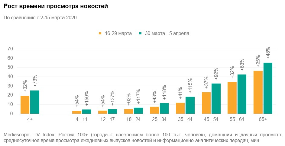 В первую неделю самоизоляции, которая в Москве и ряде других регионов была введена с 30 марта по 5 апреля, россияне старше четырех лет начали смотреть новости на 73% больше времени, чем в первой половине марта (2−15 марта) — около 25 минут в день. В 2019 году время просмотра новостей в период с 1 по 7 апреля составило всего 16 минут в день, в марте отсутствовал рост интереса к новостным передачам.