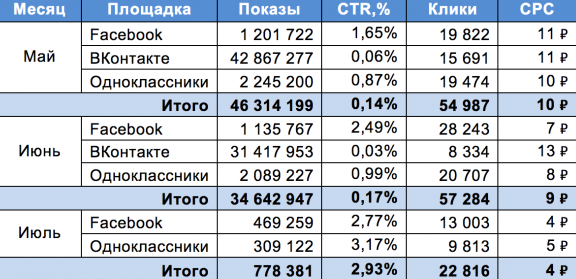 - С мая по июль мы постепенно снижали ставку. Стоимость за переход (CPC) на площадке Facebook упала с 11,32 руб. до 3,98 руб., а на площадке Одноклассники и Мой Мир — с 10,05 руб. до 4,93 руб.
