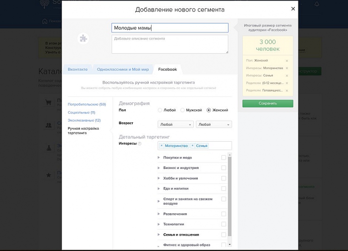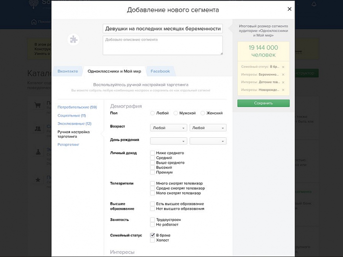 Поскольку клиенту был необходим качественный трафик по цене не более 12 рублей за переход, на данном этапе мы не ставили цель конвертировать трафик в заказы, так как он направлял на информационные сайты. Мы предложили запустить таргетированную рекламу с использованием готовых сегментов, который предлагает сервис.