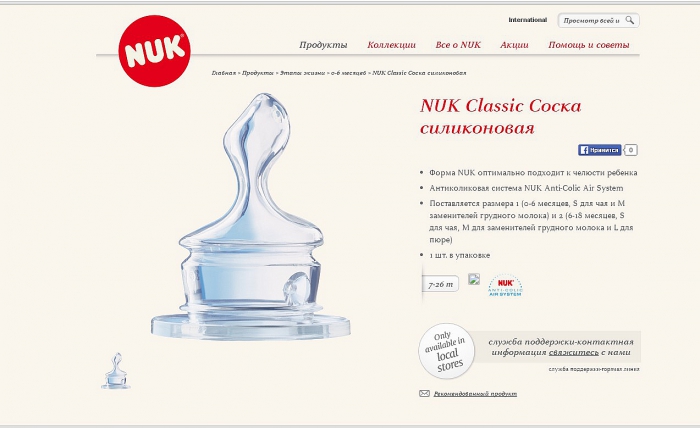 Сайт NUK построен по аналогии с Buebchen: он — информационный, без возможности оформления заказа онлайн. Представлен ассортимент, есть раздел с акциями и рекомендациями. При этом отсутствует список магазинов, где можно приобрести продукцию, что сильно влияет на цепочку продаж.