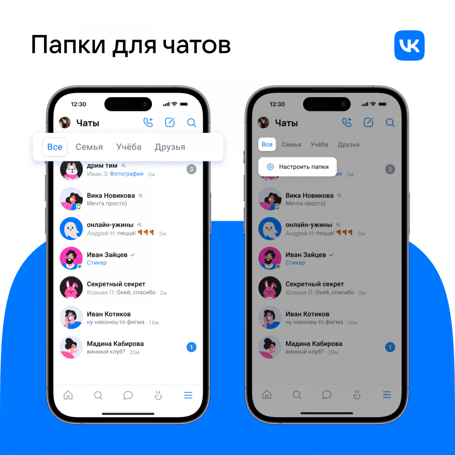 Раньше опция сортировки чатов по папкам была доступна в «VK Мессенджере», отдельном приложении для пользователей соцсети. Сейчас такая возможность появилась и в основном приложении.