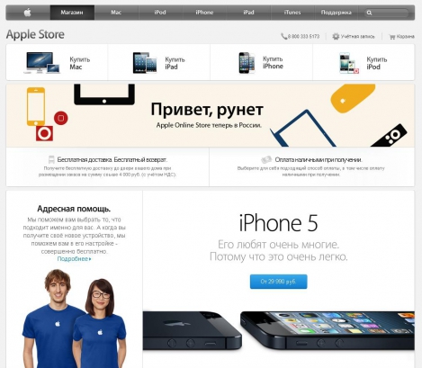 Apple открыла фирменный интернет-магазин Apple Store для российских потребителей. В нем доступны основные продукты компании – компьютеры Mac, новый MacBook Air, планшеты iPad, смартфоны iPhone, плееры iPod, а также программное обеспечение и аксессуары. Например, специально к запуску в России Apple предложила чехлы для iPhone в цветах триколора, с матрешками, в стиле «гжель» и «хохлома».
