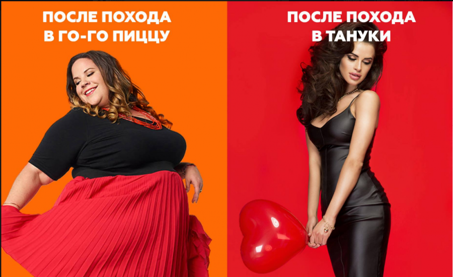 Сеть японских ресторанов разместила на официальной странице в Facebook фотографию, которая высмеивает любителей пиццы и выставляет в выгодном свете посетителей «Тануки». На одном из снимков изображена очень популярная в США телеведущая и танцовщица Уитни Тор, страдающая поликистозом яичников, из-за которого ее вес достигает 170 килограмм.