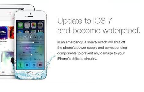 Фальшивая реклама, дизайн которой ничем не отличался от настоящих рекламных плакатов Apple, гласила: «Обновитесь до iOS 7 и станьте водонепроницаемым». Ниже следовало пояснение, согласно которому при попадании iPhone в воду, специальная «умная» программа отключит все системы устройства, что позволит сохранить смартфон в целости и сохранности.