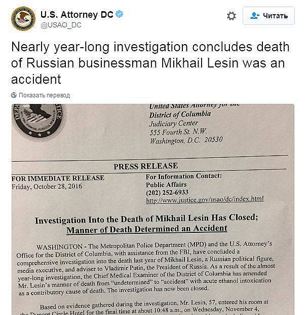 В США завершилось расследование причин смерти Михаила Лесина, «российского политического деятеля, медиаменеджера и советника Владимира Путина». Главный мэдэксперт округа Колумбия изменил формулировку с «не установлено» на «несчастный случай». Причиной, которая способствовала смерти, названа острая алкогольная интоксикация. Пресс-релиз размещен в микроблоге офиса федерального прокурора округа Колумбия.