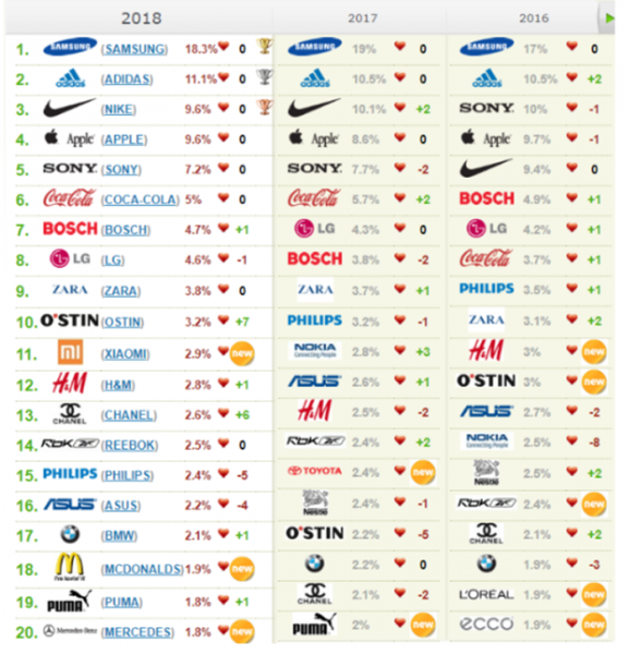 Шесть брендов, лидировавших в прошлом году в рейтинге TOP-20 проекта «Любимые бренды россиян» исследовательской компании Online Market Intelligence (OMI), сохранили свои позиции и в 2018 г. На первом месте по-прежнему Samsung. Его отрыв от Adidas, занимающего вторую строчку, немного сократился, но остается заметным. Третью и четвертую позицию фактически разделили бренды Nike и Apple. Впервые среди брендов первой десятки появился российский бренд O'STIN, в прошлом году занимавший 17 строчку.
