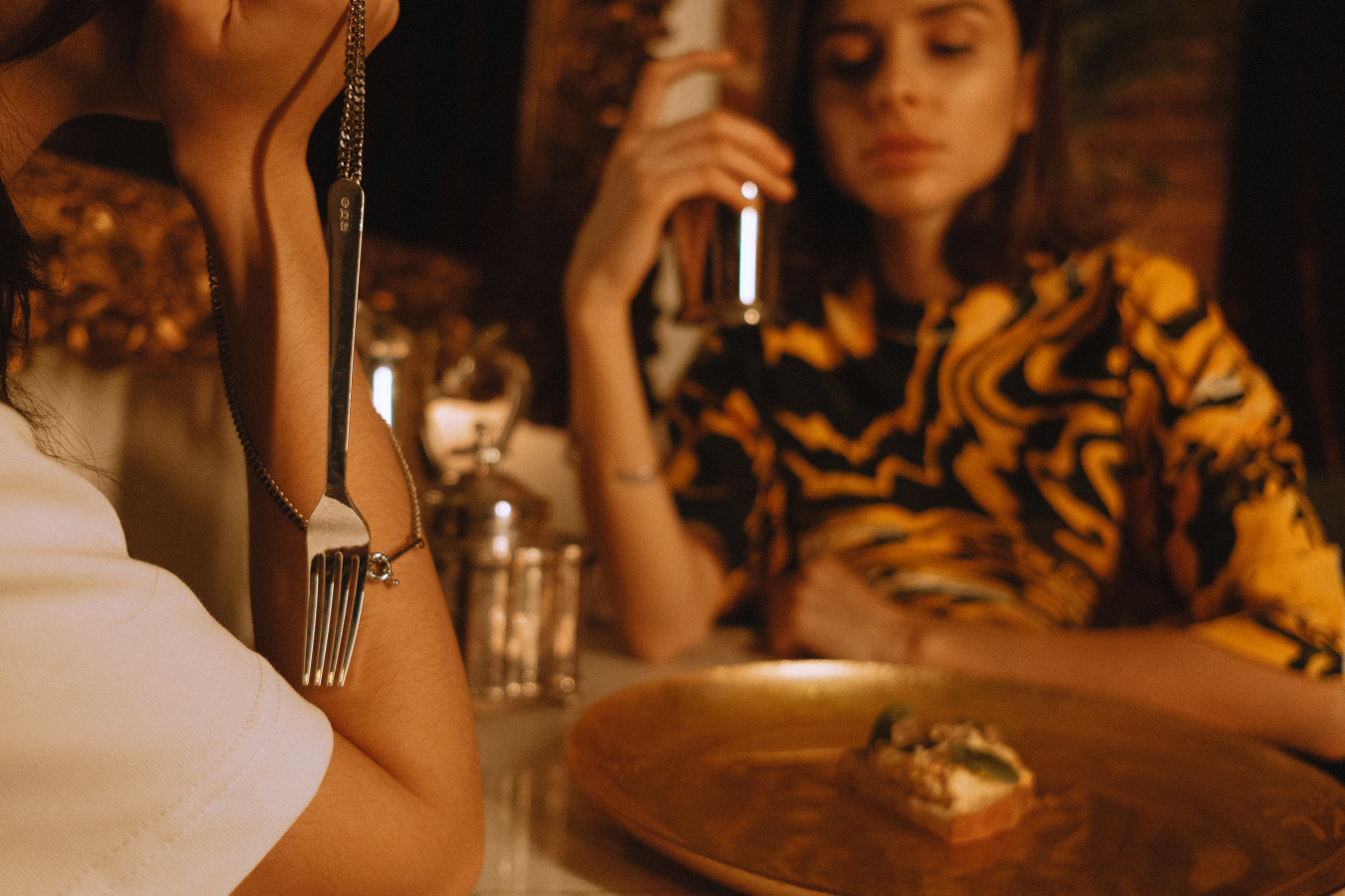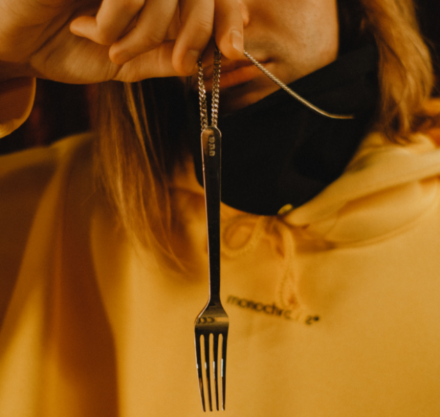 Петербургский ювелир Дмитрий Кузнецов, основатель MOZI, представлен серебряными подвесками и кольцами в форме приборов для еды. При желании столовым серебром нового поколения можно пользоваться как настоящими столовыми приборами.