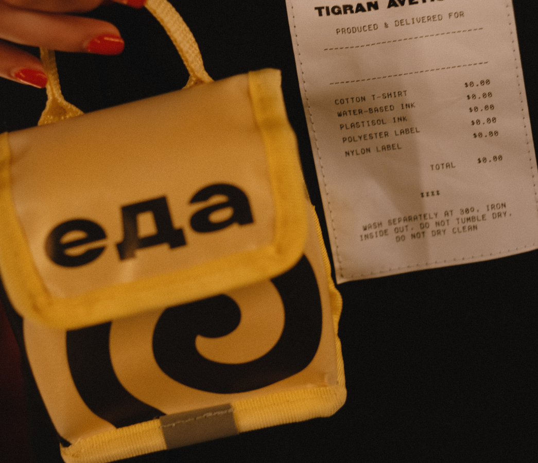 Дизайнер Тигран Аветисян, вещи которого продаются в токийском магазине Eliminator, московском KM20 и на Farfetch, предложит футболки с характерными броскими принтами. Каждая вещь отпечатана вручную и упакована в коробку для пиццы.
