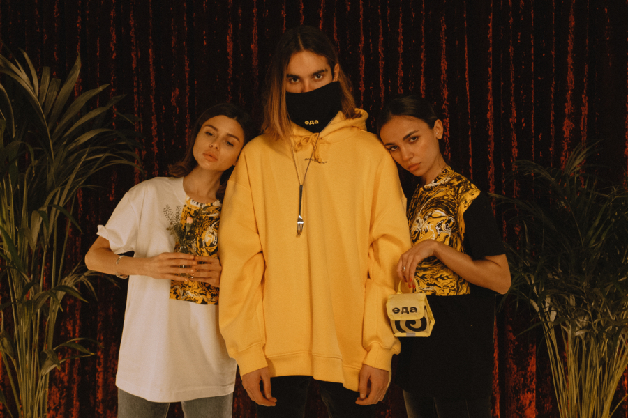 Московская мануфактура Monochrome, специализирующаяся на стиле оверсайз, пошила яркие объемные худи желтого цвета с внутренним воротом-балаклавой с надписью «ЕДА» и фирменными спиралями, запрятанными за молниями по бокам.