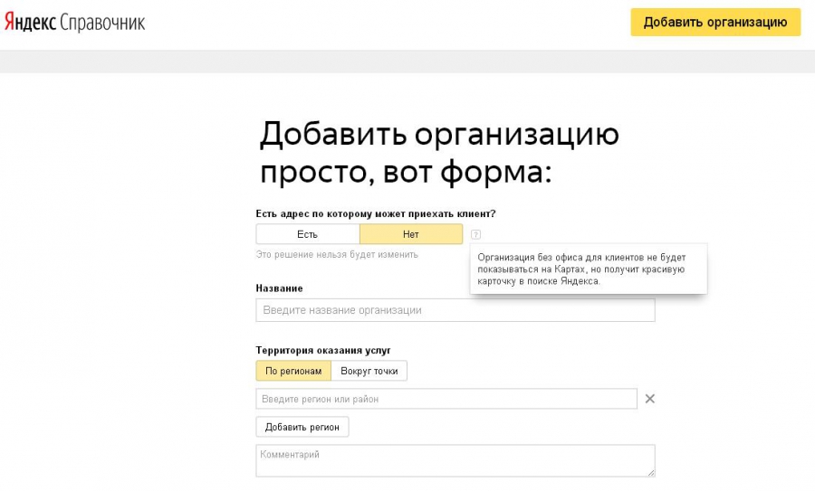 В «Яндекс.Справочнике» появилась возможность добавлять информацию об организациях, не имеющих фактического адреса, офиса или магазина. Это позволит небольшим компаниям и частным предпринимателям бесплатно рассказать о своих товарах и услугах.