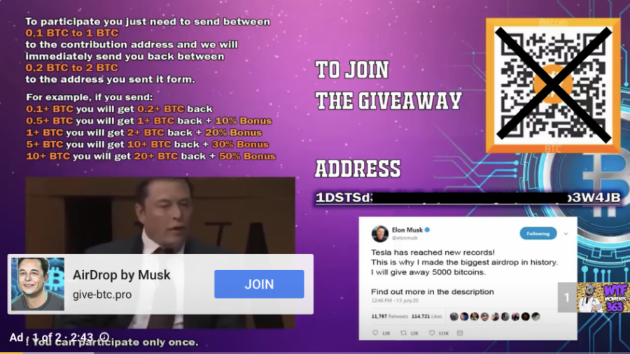 Преступники нередко используют имя Маска, чтобы обманывать неопытных пользователей. Через ролики на YouTube с обещаниями раздать криптовалюту собрали уже более $2 млн в BTC к июню, приводит издание данные bitcoinabuse.com.