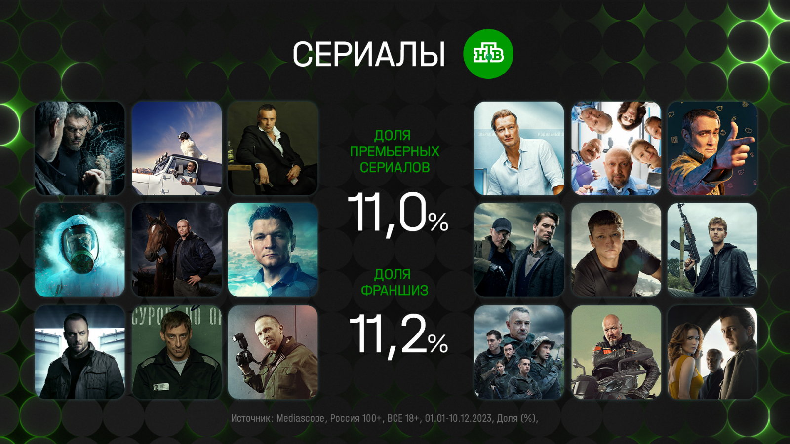 В топ-10 сериалов 2023 года вошли пять остросюжетных проектов НТВ: новинки «Акушер» с Никитой Панфиловым и «Хозяин» с Денисом Никифоровым и три франшизы канала: «Первый отдел», «Бим» и «Невский». Мы рады, что у нас сформировалась линейка рейтинговых франшиз, запуская которые мы можем быть уверены в цифрах. И если смотреть на всех жителей России старше 18 лет, то в 2023 году 13,2% зрителей выбирали продолжения наших остросюжетных проектов. Хорошо работающие франшизы позволяют нам экспериментировать с новыми сериалами и создавать имиджевые проекты. Уже совсем скоро мы покажем «Слово пацана. Кровь на асфальте», «ГДР», «10 дней до весны», «Золотое дно», «Запасный выход», «Страх над Невой» и другие.