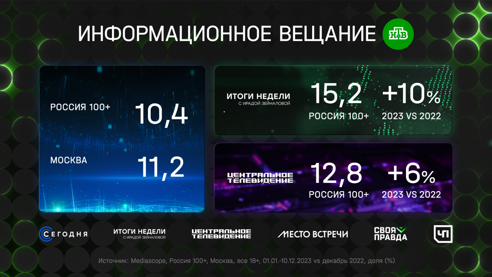 Информационное вещание остаётся визитной карточкой НТВ. Так, по данным Mediascope, в 2023 году доля информационно-аналитической программы «Итоги недели с Ирадой Зейналовой» выросла на 10% относительно декабря 2022 года и составила 15,2% среди зрителей старше 18 лет. Максимальная доля достигала 18,4%. «Итоги недели» с Ирадой Зейналовой — № 2 среди всех итоговых информационно-аналитических программ недели. У одного из лидеров субботних новостей — «Центрального телевидения с Вадимом Такменёвым» — доля выросла на 6% и составила 12,8%, максимальная доля — 16,0%. Доля социально-политического ток-шоу «Место встречи» с Андреем Норкиным выросла на 8% и составила 11,4% в аудитории 18+, максимальная доля — 13,9%.
