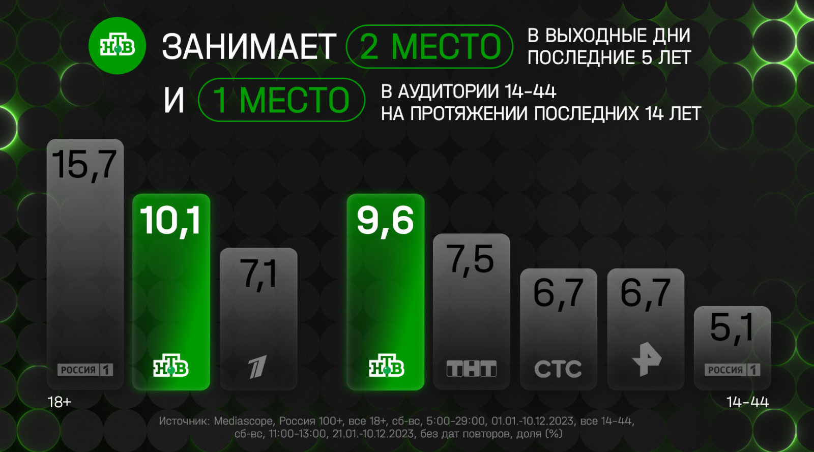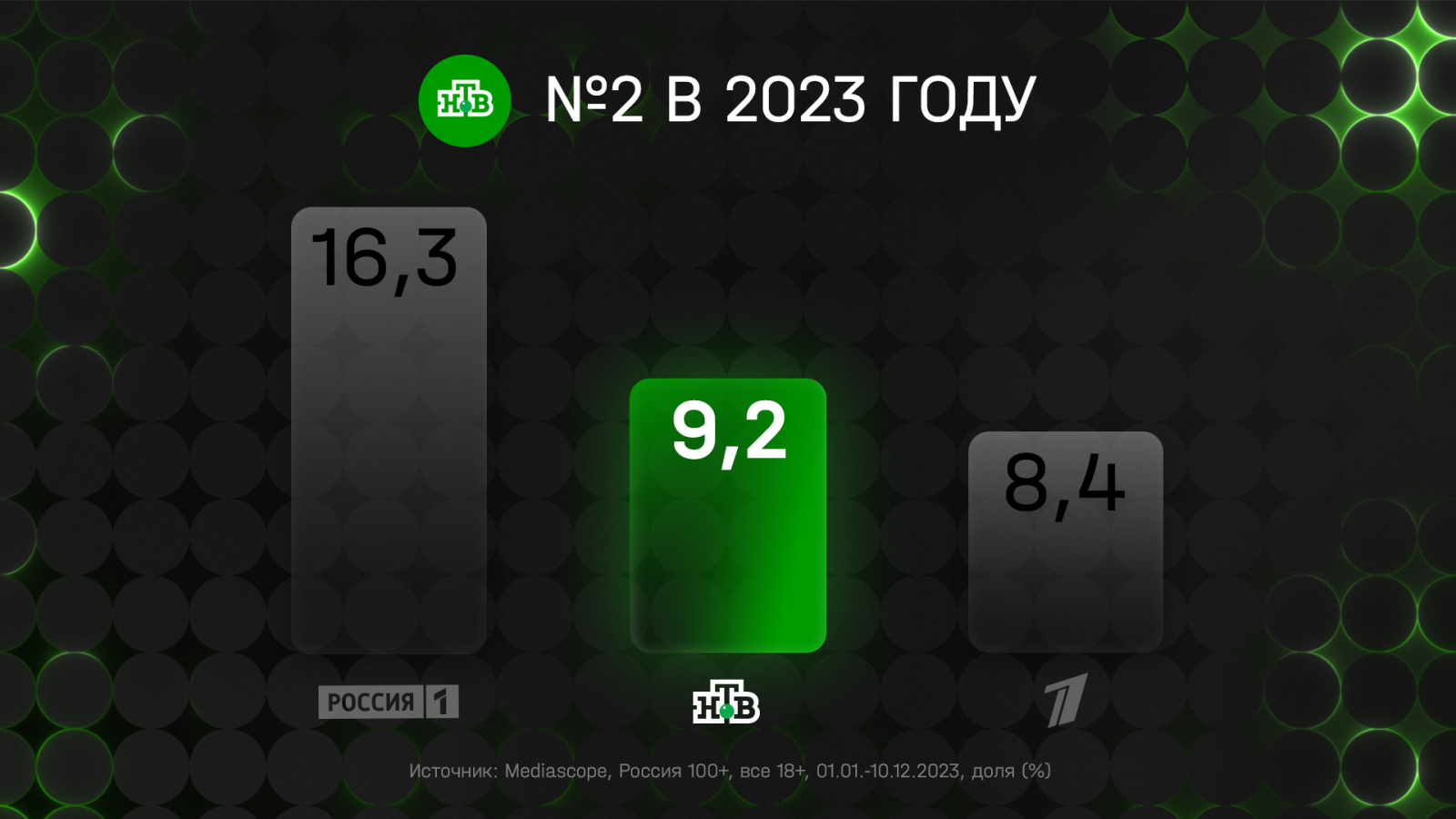 Наш юбилейный год мы завершаем с отличными показателями. По итогам 2023 года, НТВ уверенно второй среди зрителей старше 18 лет в городах с населением более 100 тыс. человек. А среди жителей всей России — № 2 среди всех российских телеканалов второй год подряд. В 2023 году мы существенно увеличили отрыв с «Первым каналом» и с долей 10,2% уступаем только каналу «Россия 1». Именно благодаря сбалансированной сетке, в которой присутствует абсолютно разный контент, от новостей и общественно-политических ток-шоу до сериалов и масштабных развлекательных шоу, НТВ смог не только удержать лояльного зрителя, но и, что для нас особенно важно, привлечь молодую и женскую аудитории. Так, доля НТВ в 14−44 выросла на 3%, прирост женщин 14−39 также составил 3%. А в будни приросты в этих аудиториях ещё выше — 6% и 8% соответственно.