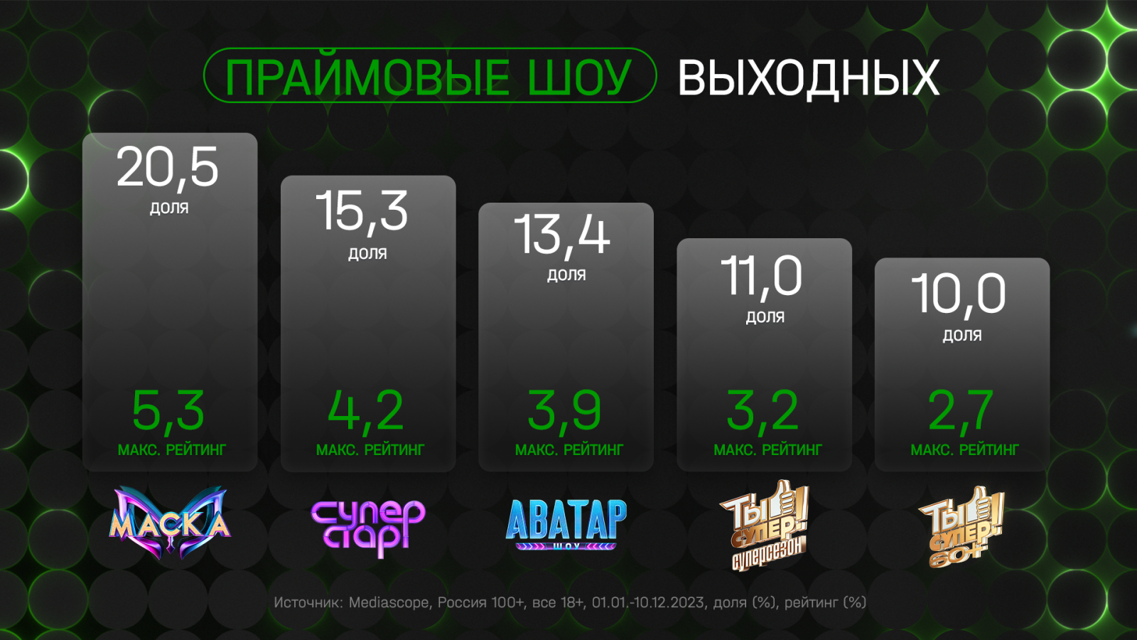- четвёртого сезона шоу «Суперстар!» — доля 15,3% и рейтинг 4,2%;