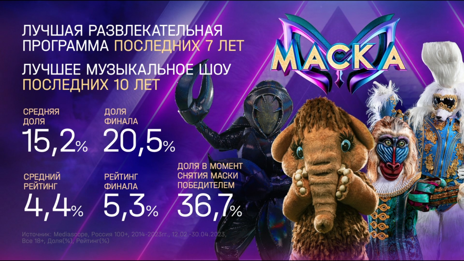 Развлекательные шоу НТВ оказались в топе развлекательных проектов на российском телевидении. «Маска» — лучшее шоу последних 10 лет и лучшая развлекательная программа последних семи лет на российском телевидении, рассказала команда телеканала со ссылкой на Mediascope. Средняя доля показа четвёртого сезона составила 15,2% (рейтинг 4,4%). 30 апреля в прямом эфире состоялся финал: средняя доля заключительного выпуска среди зрителей в крупных городах старше 18 лет составила 20,5%, рейтинг — 5,3%. За самым интригующим моментом финала — определением победителя четвёртого сезона шоу — следило 36,7% телезрителей.