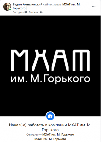 Бывший пресс-секретарь Роскомнадзора Вадим Ампелонский занял должность PR-директора в Московском Художественном академическом театре имени М. Горького (МХАТ имени М. Горького). Об этом он сообщил на своей странице в Facebook.