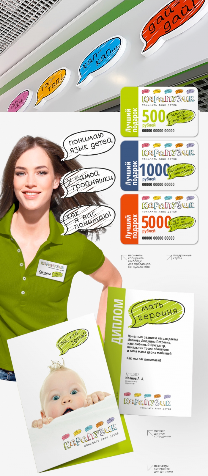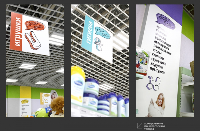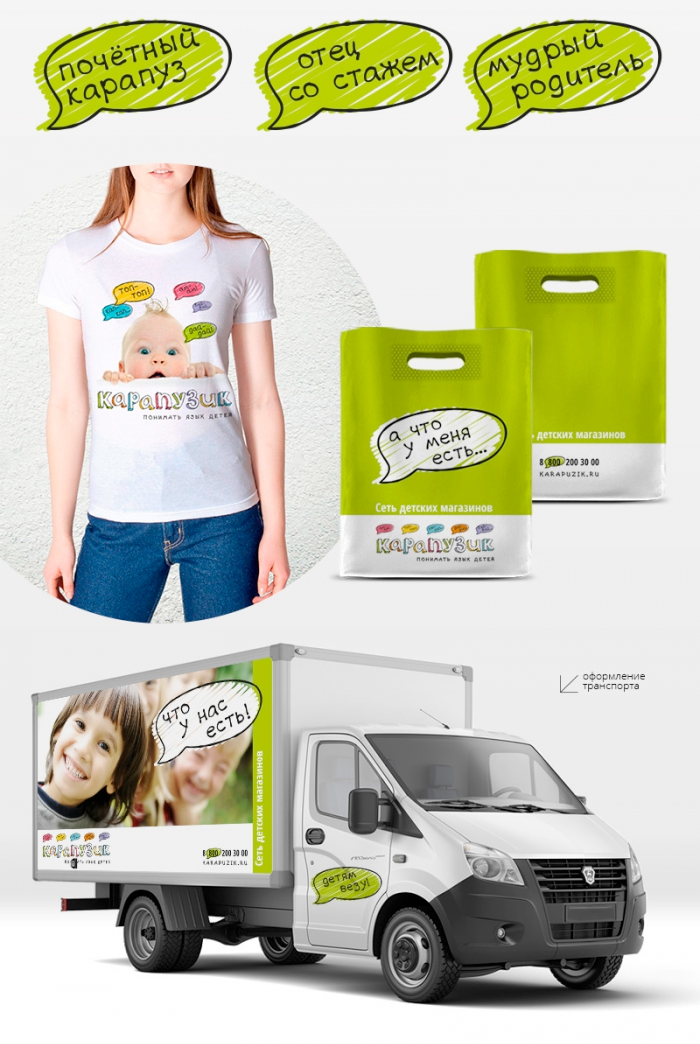 Так появилась яркая и современная айдентика сети «Карапузик», которая позволила сформировать кардинально новый уровень потребительского восприятия марки. Акцент был сделан на эмоциональных бенефитах, которые нашли отражение не только в визуальной концепции бренда, но и во всем оформлении торгового пространства. За счет работающей системы коммуникации («говорящих» символов, пиктограмм, цветового кодирования, изображений и фото) был создан образ дружелюбного, вызывающего к себе доверие детского магазина, который в доступной игровой форме учит покупателей понимать детей, их язык и потребности.