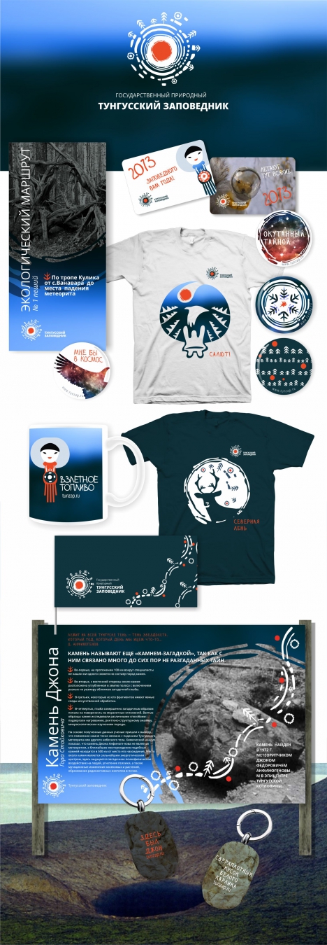Воронежское брендинговое агентство VarioBrands создало для тунгусского заповедника логотип и стиль с элементами космической тематики, природных особенностей заповедника и национального колорита эвенков.