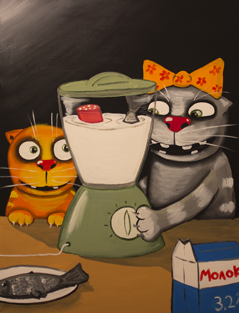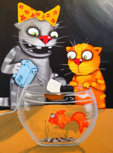 «Получив от компании «Эльдорадо» два месяца назад предложение нарисовать картины про семью любимых котов, я решил Кошкины - это моя тема. Многие сюжеты я подсматриваю в жизни, подмечая их и в своей семье. А коты - это те же люди, только в некотором роде лучше, у каждого из них должна быть своя крепкая семья. «Эльдорадо» - компания, которая с радостью взяла под свою опеку семью Кошкиных», - рассказал Вася Ложкин.