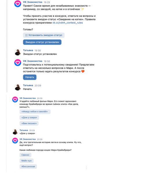 Пока случайный пользователь искал пару для романтического или дружеского общения, он мог свайпнуть вправо и увидеть анкету звезды. Претендентам на свидание нужно было не только найти анкеты артистов, но и выполнить задания от чат-бота. В том числе ответить на вопросы о биографии и творчестве исполнителей: например, какое музыкальное образование получил Jony или какую породу кошек любит Мари Краймбрери. И, конечно, продолжить строки из треков исполнителей.