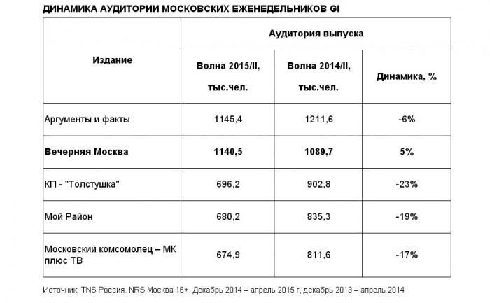 Еженедельник «Вечерняя Москва» также наращивает аудиторию. «Вечерняя Москва» - единственное издание в сегменте московских еженедельников GI, демонстрирующее рост по сравнению с аналогичным периодом прошлого года. В условиях падающего рынка аудитория издания выросла на 5 %. В то время как аудитория «КП w» сократилась на 23%, «Моего района» - на 19%, а «МК плюс ТВ» - на 17%.