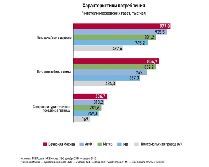 Читатели «Вечерней Москвы» активно посещают столичные кафе и рестораны (723,4 тыс. в аудитории выпуска) проводят досуг в кино (500 тыс.) и театрах (398,7 тыс.). В аудитории синдиката максимальный, среди самых читаемых столичных газет, охват владельцев загородной недвижимости, владельцев автомобилей и туристов, отдыхающих за границей.