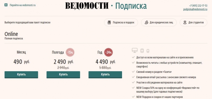 Для тех, кто привык читать на смартфоне и кому этого достаточно, газета запустила отдельную мобильную подписку. Она дает доступ к платным материалам только на смартфоне за 3 рубля в день. Средства списываются со счета телефона. Такая подписка доступна абонентам «Билайна», «МегаФона», МТС и Tele2, ее можно оформить на мобильном сайте m.vedomosti.ru.