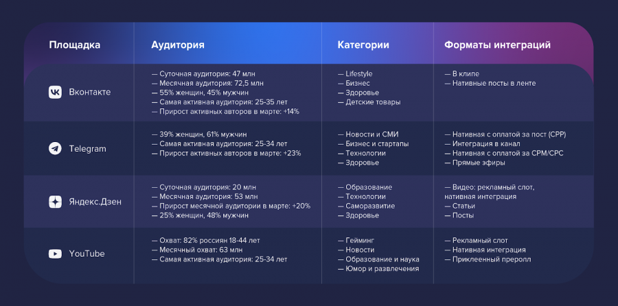 Пока обстановка на инфлюенс-рынке не стабилизировалась, рекомендуем обратить внимание на те площадки, которые уже успели набрать аудиторию и заработать репутацию.