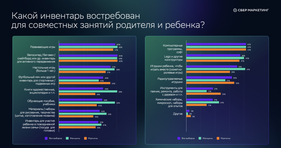 В ходе опроса респонденты также рассказали о наиболее популярных покупках для совместного досуга с детьми. Первое место у 60% респондентов занимают развивающие игры и инвентарь для активного передвижения: велосипед, беговел, скейтборд и так далее. Следом идут настольные игры — они набирают 54% приверженцев среди родителей. Тройку лидеров замыкают товары для подвижных игр (49%), книги (49%) и обучающие пособия (48%). При этом папы чаще выбирают инвентарь для спортивных игр (мячи, клюшки